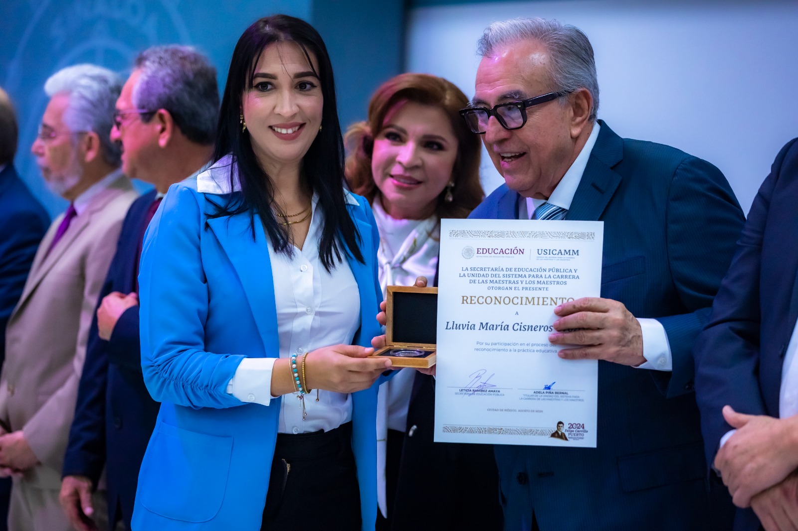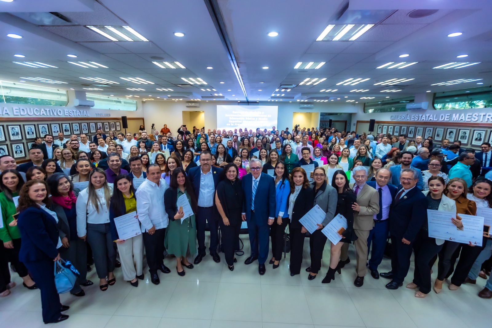 Acompañado por la secretaria de Educación Pública y Cultura, Gloria Himelda Félix Niebla; y por ambos dirigentes del Sindicato Nacional de Trabajadores de la Educación (SNTE), Secciones 53 y 27, Ricardo Madrid Uriarte, y Genaro Torrecillas López, respectivamente, el mandatario estatal entregó este reconocimiento a cada de las 140 maestras y maestros, en la Sala Rina Cuellar, del Edificio Justo Sierra, de la SEPyC.