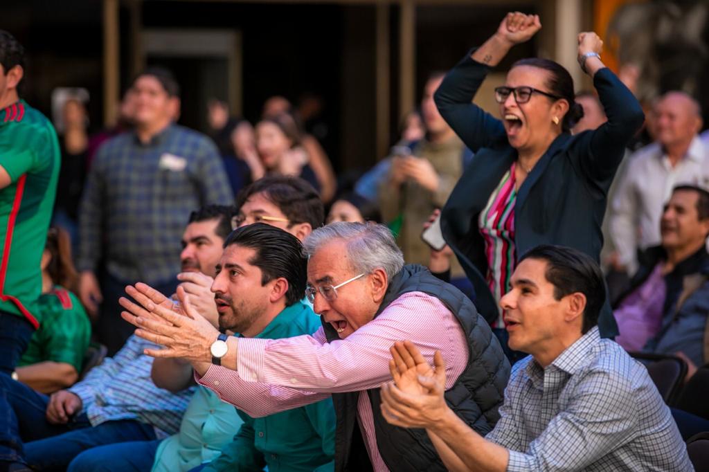 El mandatario estatal bajó a la explanada central de Palacio de Gobierno, donde fueron colocadas dos megapantallas para presenciar el debut de México, y en compañía de la mayoría de los secretarios de su gabinete, se dispuso a disfrutar de este cotejo, durante las dos horas que duró el partido.