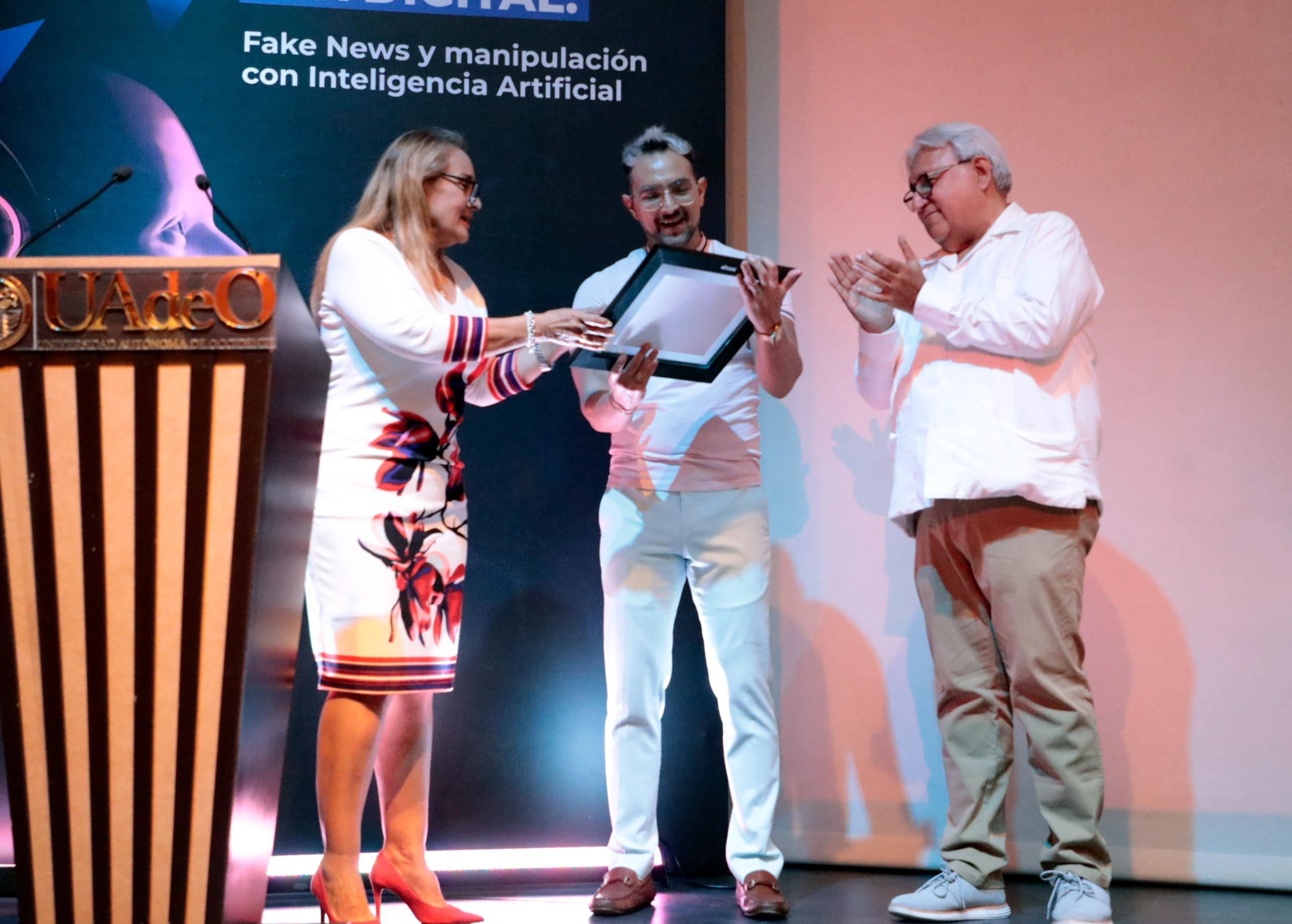 “Cierto es también que con Inteligencia Artificial se puede fabricar información falsa o manipulada que pase por información verídica, pero ¿hasta dónde es posible detectarla, qué factores podemos tomar en cuenta para saber si un material fotográfico, de video, de audio, es falso o no?”, dijo antes de dar la palabra al especialista en la materia para responder esas preguntas en el desarrollo de su conferencia, misma que se transmitió en vivo a través del portal de Antena Lince de la UAdeO a todas las Unidades Académicas y Extensiones en el resto del estado.