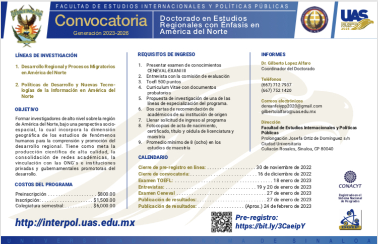 La Facultad de Estudios Internacionales y Políticas Públicas (FEIyPP) de la Universidad Autónoma de Sinaloa (UAS) mantiene abierta la convocatoria para cursar la Maestría en Estudios Políticos y Sociales y el Doctorado en Estudios Regionales con énfasis en América del Norte que están programados para iniciar en el mes de marzo de 2023.