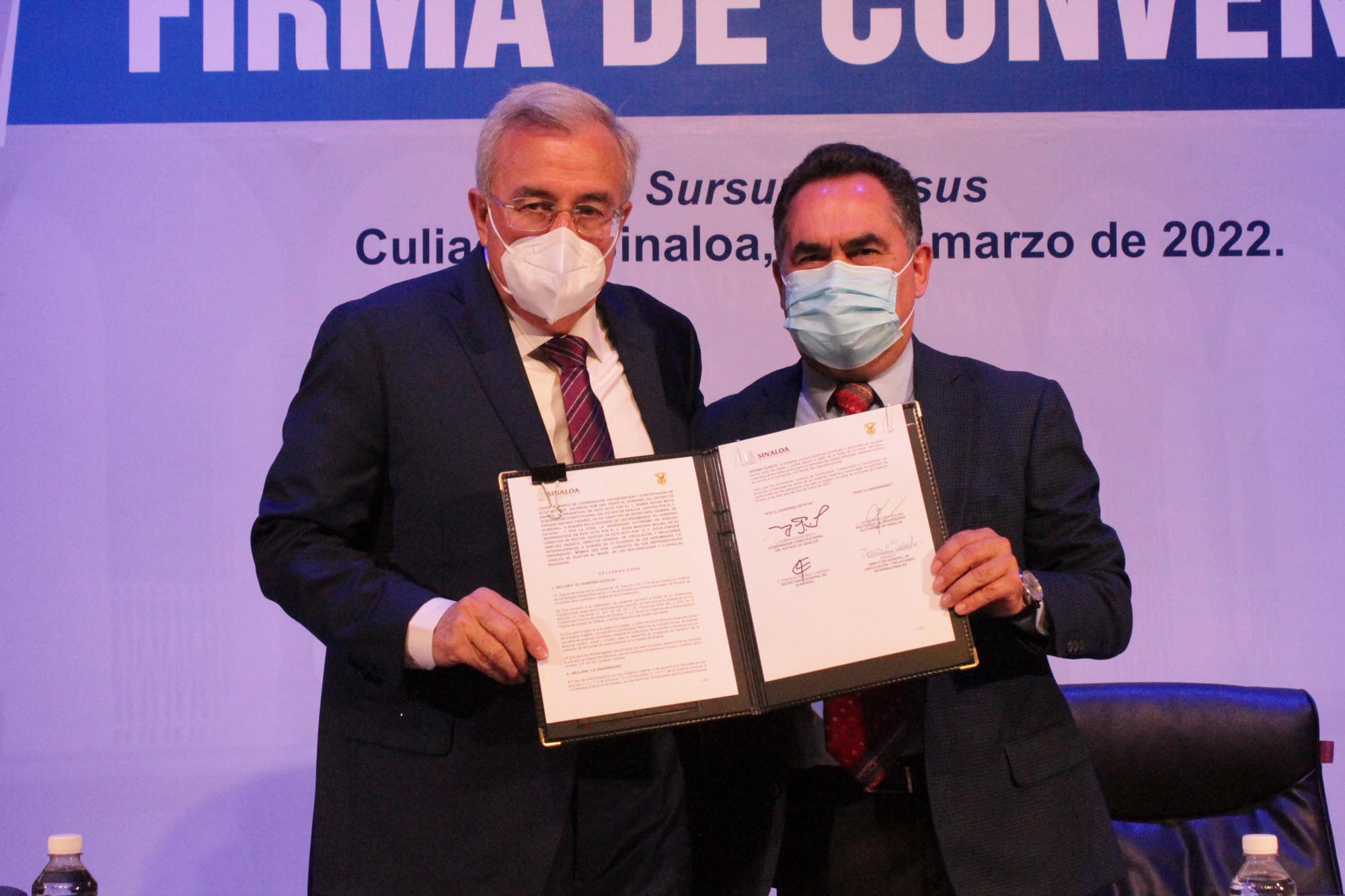 En evento realizado en el Teatro de la Torre Académica Culiacán, el dirigente universitario y el Gobernador Constitucional del Estado de Sinaloa, doctor Rubén Rocha Moya, signaron el convenio, el cual establece que ambas instituciones se comprometen a trabajar por el desarrollo educativo, científico, cultural y deportivo de la comunidad universitaria y de Sinaloa.