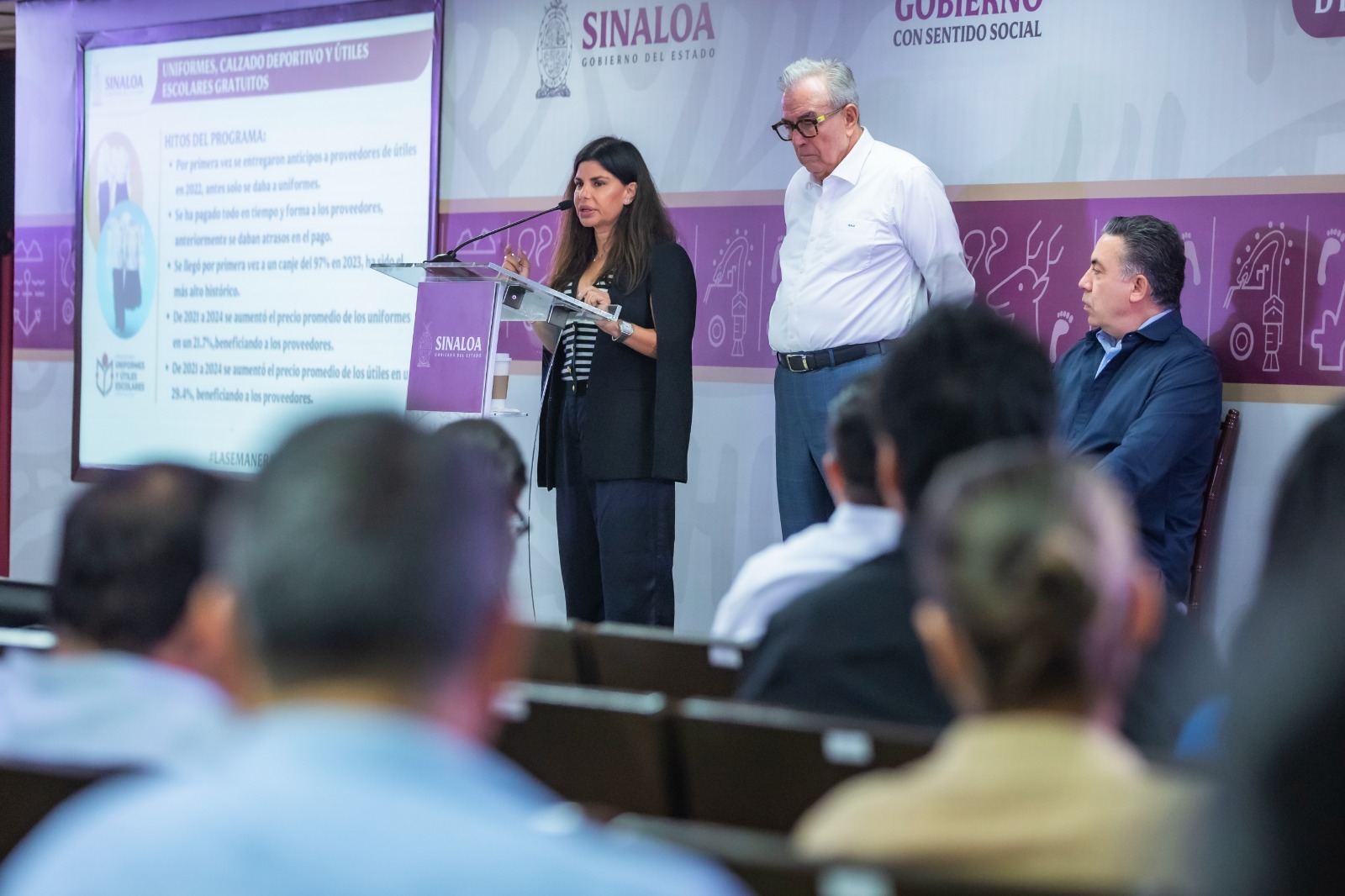 Adriana Rojo Zazueta, Secretaria Técnica de la Secretaría de Economía, informó que para el ciclo escolar 2024-2025 se invirtieron 320 millones de pesos, a fin de entregar 995 mil 772 uniformes, 497 mil 886 paquetes de útiles escolares y 70 mil 618 pares de calzado deportivo, al alumnado sinaloense.