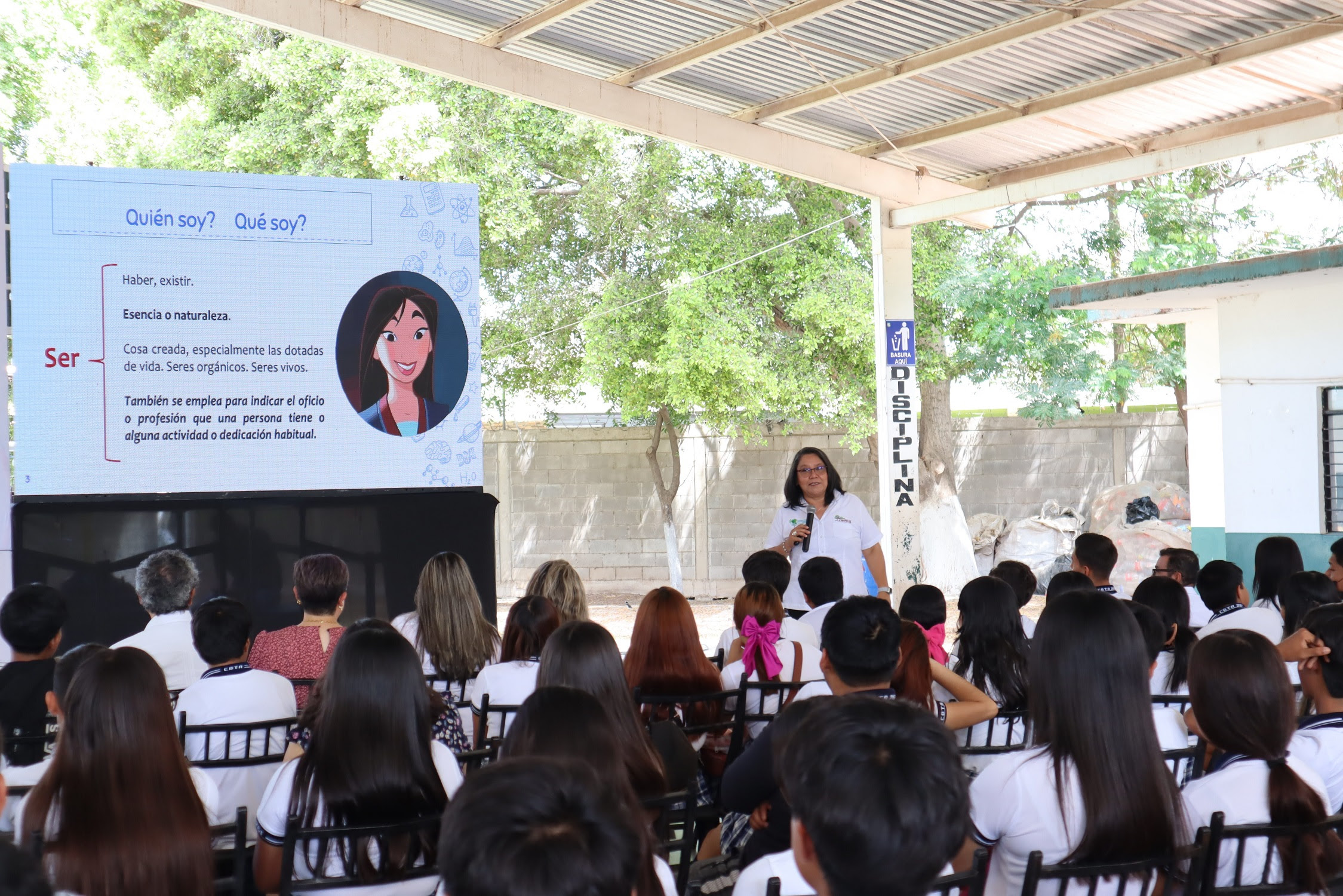 La doctora Diana Escobedo comenzó preguntando a los estudiantes si reconocían las imágenes de ciertas personas destacadas o ciertas profesiones para explicarles qué hace a una persona lo que es y qué los motiva a ejercer la carrera a la que se dedicarán a lo largo de su vida.