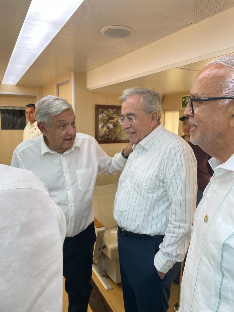 El Ejecutivo Estatal fue recibido en el transbordador por el anfitrión Miguel Ángel Navarro Quintero, Gobernador de Nayarit, quien le brindó la bienvenida a la travesía hacia la Isla.