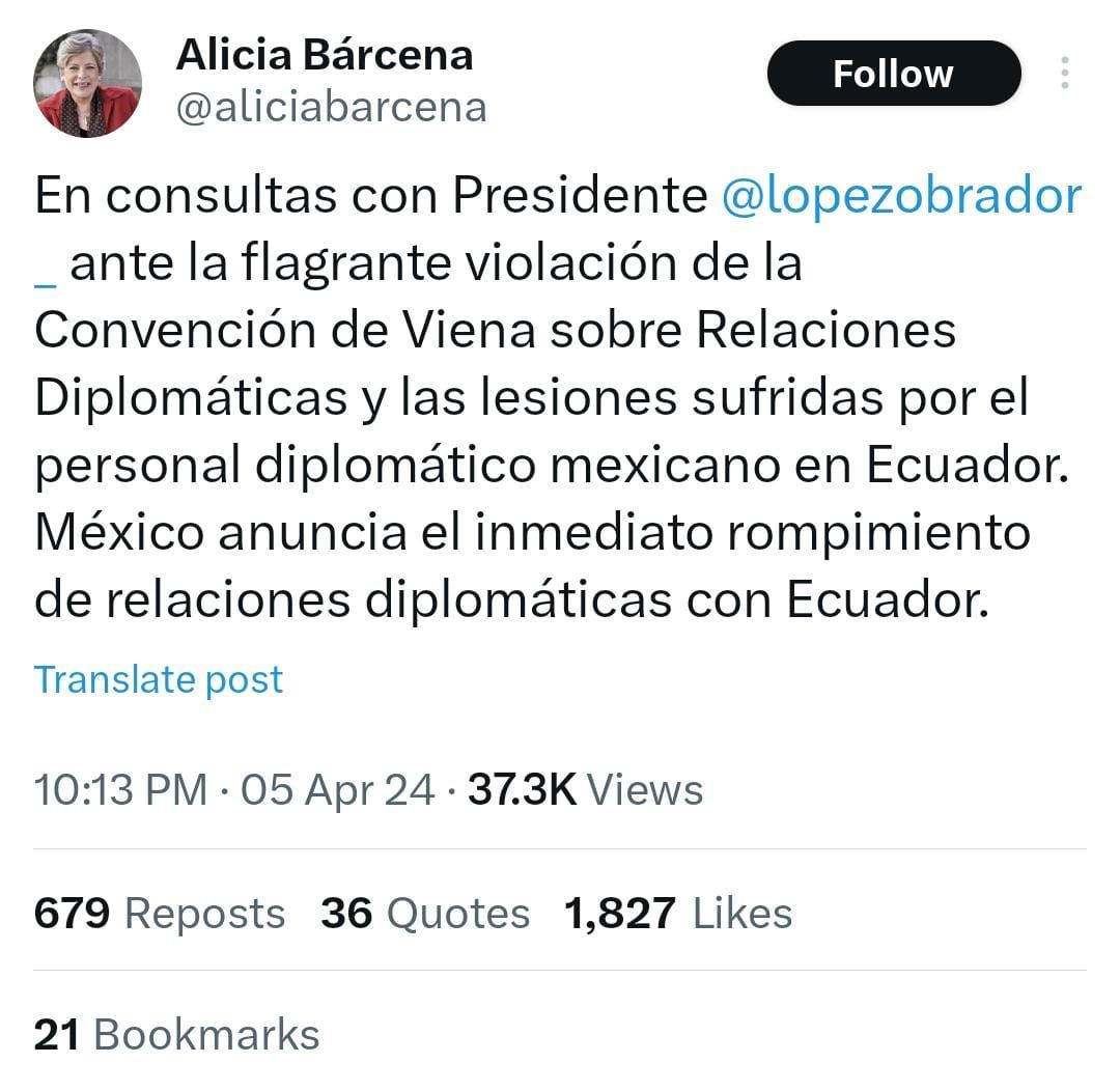 “Se trata de una violación flagrante al derecho internacional y a la soberanía de México, por lo cual le he instruido a nuestra canciller que emita un comunicado sobre este hecho autoritario, proceda de manera legal y de inmediato declare la suspensión de relaciones diplomáticas con el gobierno de Ecuador”, expresó el Presidente.