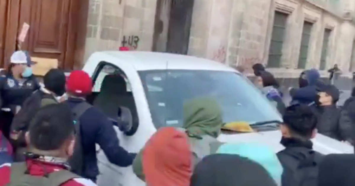 Estudiantes normalistas arrojaron petardos y chocaron una camioneta contra una puerta para ingresar a Palacio Nacional durante la conferencia de AMLO